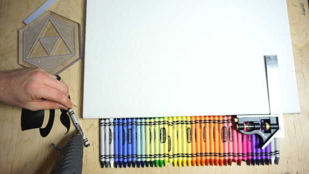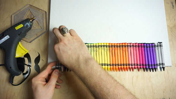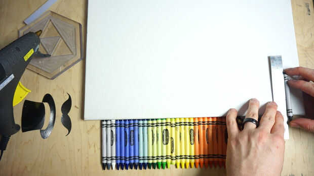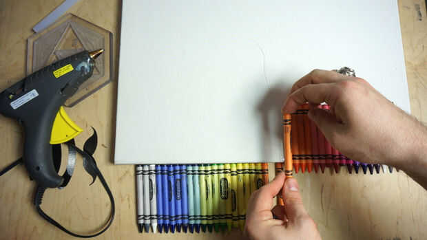 Utilicé una pistola de pegamento caliente y se adhirieron las ceras directamente a la lona. Trate de usar una pistola de pegamento caliente de baja temperatura. Me tomó cerca de 5 lápices de colores para darse cuenta de que necesitaba para encender el calor a bajo de mi pistola de pegamento.