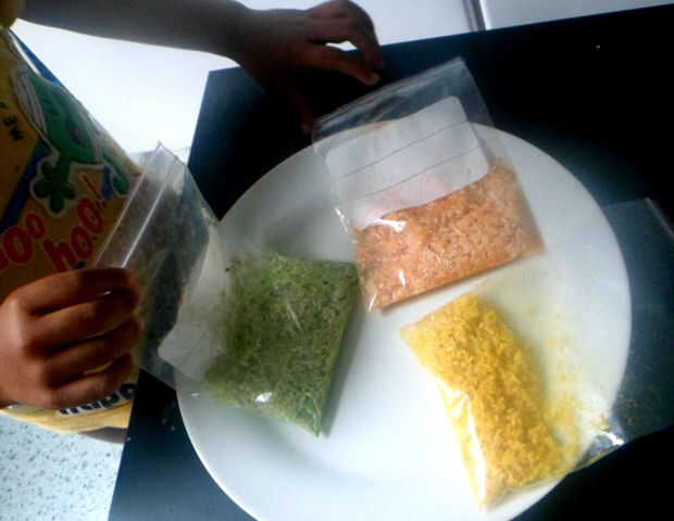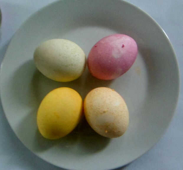 -Utilizando diferentes colores arroz teñimos los huevos.