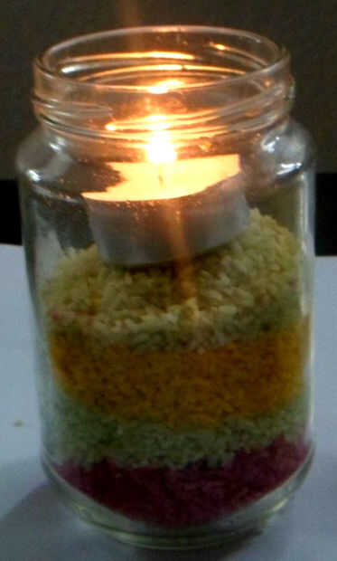 -Tome un tarro de masón y añadirle este arroz coloreado. Cuando le pones una vela y lo aligera verá un hermoso Portavelas listo para la decoración.