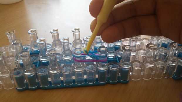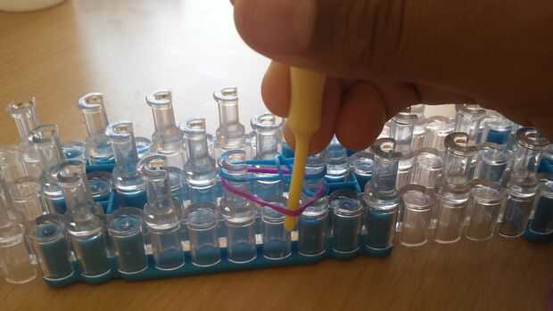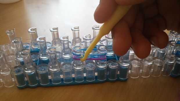 manera fácil de hacer una pulsera de cola de pescado en cualquier lugar.Paso 1: materiales Todo lo que necesitas esSu elección de colores de gomasy un clip C o SPaso 2: Poner la primera banda de goma de color en una figura de ocho en los dos dedos. P