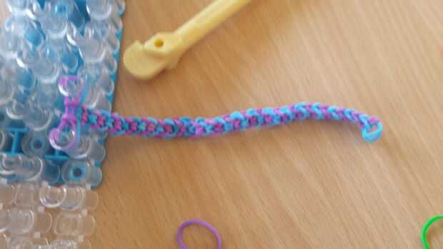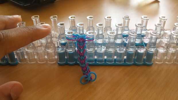 así es como luce la pulsera de cola de pescadoPaso 1: Tomar una de sus bandas de goma y enrosque en un ochoPaso 2: Colocarla en el telarPaso 3: Añadir una banda elástica que no se tuerce en un ochoPaso 4: Agregar otra banda de gomaPaso 5: Tomar su ga