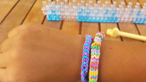 manera fácil de hacer una pulsera de cola de pescado en cualquier lugar.Paso 1: materiales Todo lo que necesitas esSu elección de colores de gomasy un clip C o SPaso 2: Poner la primera banda de goma de color en una figura de ocho en los dos dedos. P