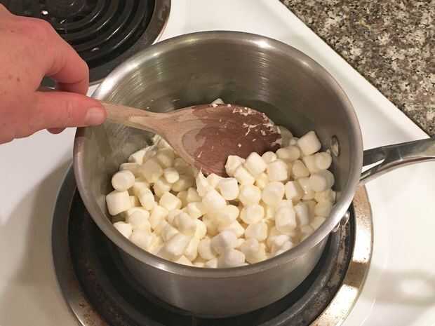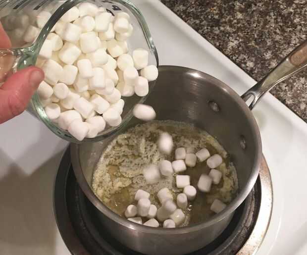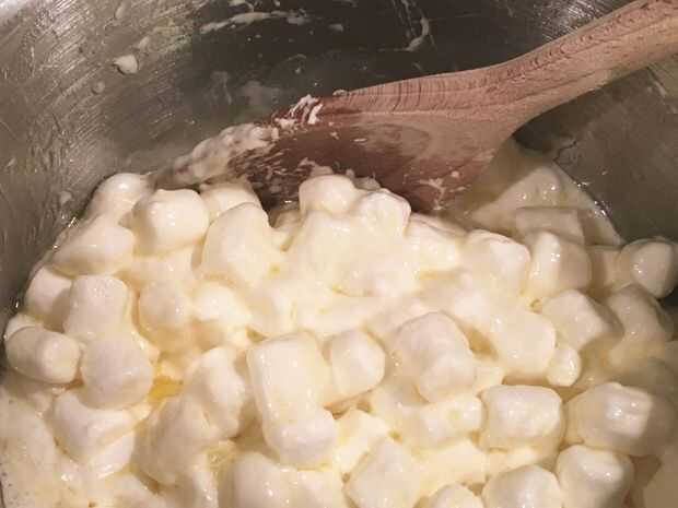 Una vez que la mantequilla se haya derretido puede agregar tus malvaviscos. Utilicé toda la bolsa de malvaviscos mini para este Instructable. Revolver constantemente, asegurando incluso mezclar sus fusión malvaviscos y la mantequilla. Mantener la calefacción hasta que los malvaviscos se han derretido completamente y ya no puede distinguir solo malvaviscos.