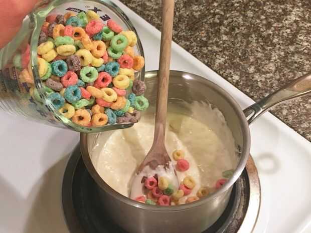 Froot Loops son mucho mayores que el habitual arroz Krispies, querrás tener cuidado cuando se mezcla para que no romper los lazos.