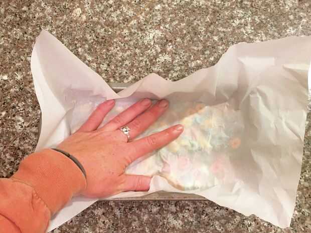 Una vez mezclado adecuadamente, transferir la mezcla de malvavisco de cereal a su plato para hornear con mantequilla. Luego, utilizando un trozo de papel de cera, presione su krispies para que tengan una forma uniforme y superior.
