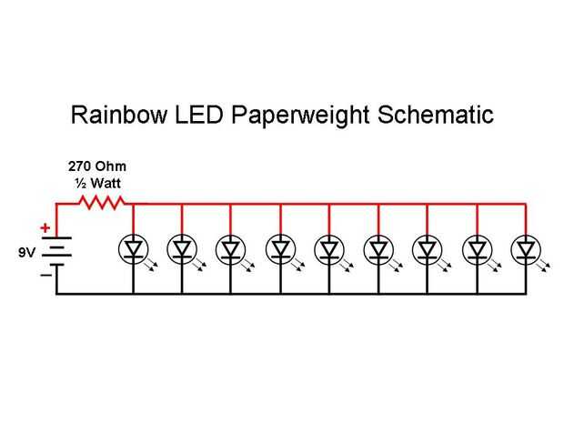 El circuito es muy simple como se muestra en el esquema a continuación. Nueve color lento cambio LEDs están conectados en paralelo con una resistencia de 270 ohmios 1/2 watt entre los LEDs y el lado positivo de la batería. Se utiliza una batería estándar de 9 voltios para la alimentación de los LEDs.