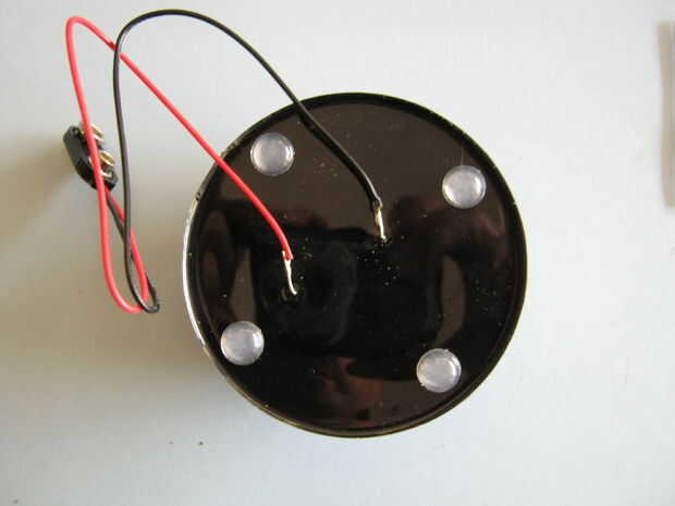 5. Usando sus notas de cual cable es cual, soldar el cable rojo de clip de la batería de 9 voltios al cable positivo (resistor) sobresale el pisapapeles.  Suelde el cable negro del clip de la batería de 9 voltios con el otro cable.  Doble suavemente los cables para ser plano con la superficie de pisapapeles como se muestra en la tercera foto.