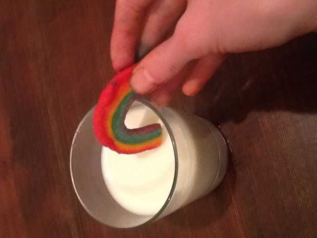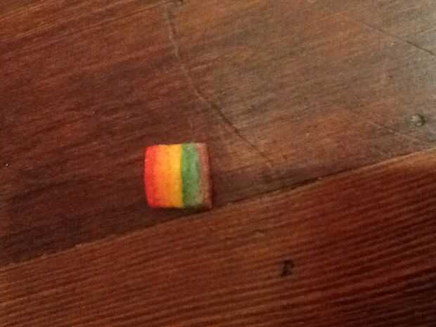 Lugar el rectángulo en una galleta de aluminio cubierta de la cacerola 1/4 de pulgada rodajas y luego corta en cuadrados de arco iris. También podría curva rodajas todos en arco iris completadas! Yay