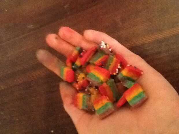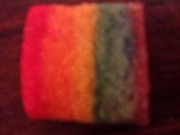 Cada sección del rodillo en un rectángulo grueso de 1/4 de pulgada menos y apilarlas en hacia atrás orden del arco iris (violeta, azul, verde, amarillo, naranja, rojo)