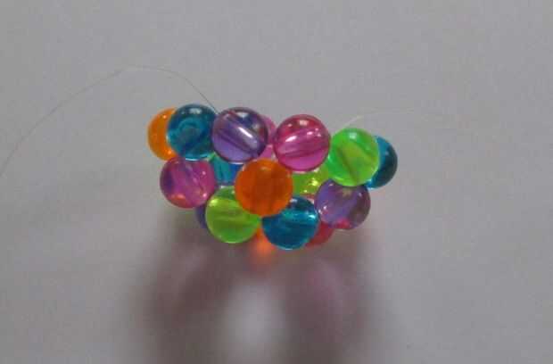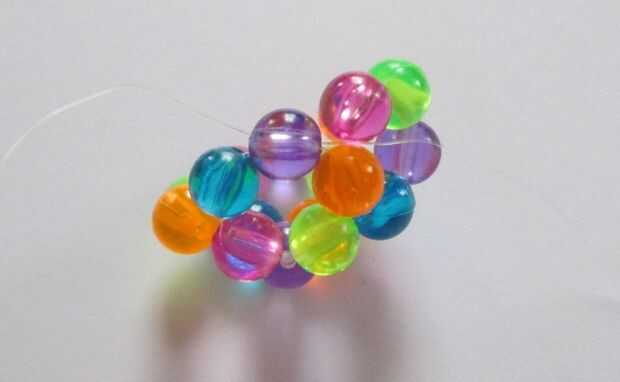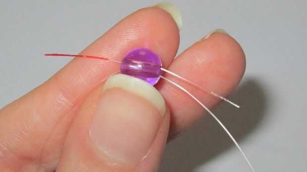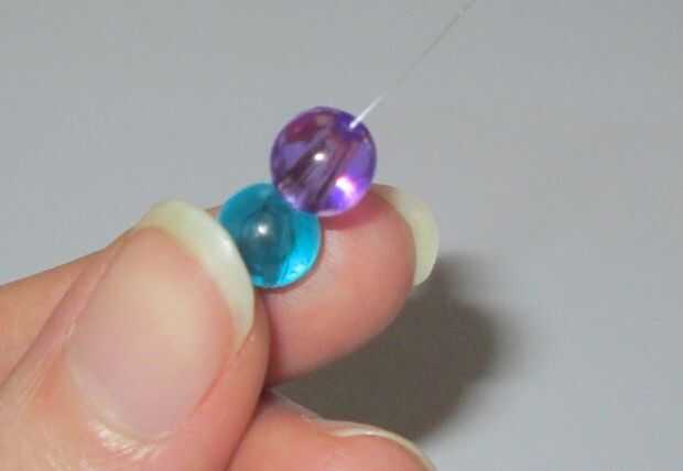 2. pasar el extremo derecho (pintado) el último grano (púrpura) en la dirección opuesta