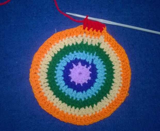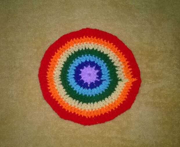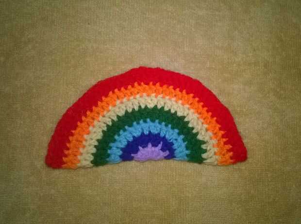 lo dibujó, lo soñado, puse.Yo de ganchillo un cuadrado granny en rojo, luego en naranja que yo de ganchillo alrededor de 3 lados entonces lo mismo con el amarillo, verde, azul púrpura entonces. Luego añadí púrpura en la parte superior de la camisa.
