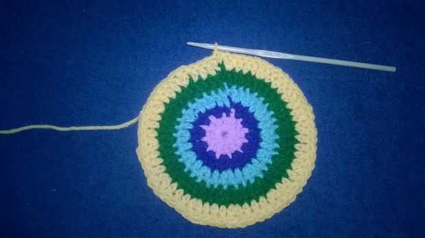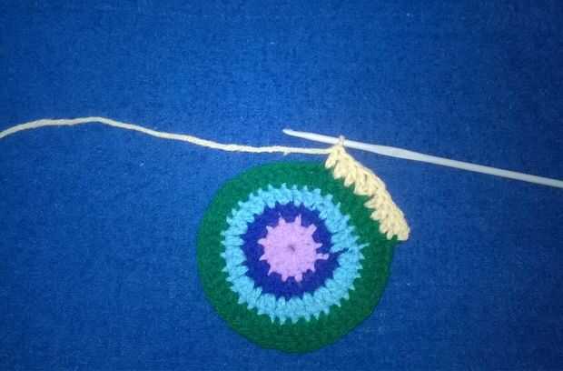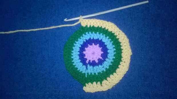 lo dibujó, lo soñado, puse.Yo de ganchillo un cuadrado granny en rojo, luego en naranja que yo de ganchillo alrededor de 3 lados entonces lo mismo con el amarillo, verde, azul púrpura entonces. Luego añadí púrpura en la parte superior de la camisa.