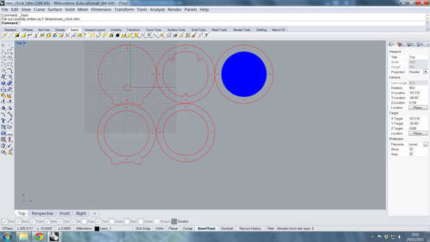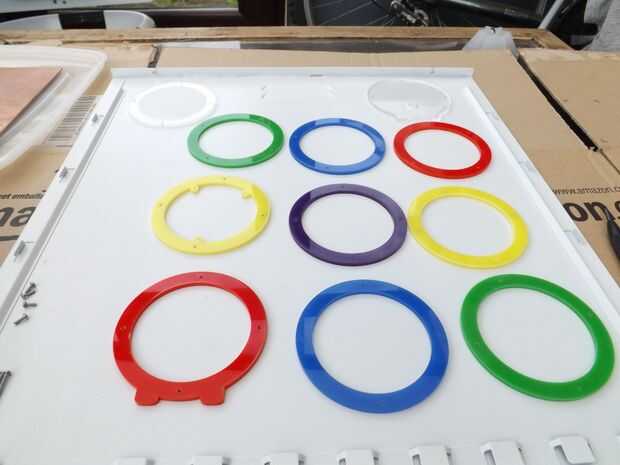 Como se mencionó anteriormente, el caso era corte de varias hojas de acrílico color láser. La parte delantera la mayoría es claro con un círculo helado que fue producido por la viga de la exploración de trama. La siguiente pieza es un anillo rojo que tiene dos pies para mantener el reloj vertical, que estos también están incluidos en la pieza de vuelta clara, la pieza posterior también tiene un agujero para el cable de alimentación. La tercera pieza es de color amarilla y tiene tres accesorios internos para montar un PCB, también funcionan para sostener los anillos de Pixel Neo en su lugar. Todas las piezas son anillos idénticos. Todas las piezas tienen 4 agujeros en la misma posición en cada anillo, estos son utilizados por los tornillos autoroscantes para unir los anillos. Puede descargar el siguiente diseño, incluye la pieza frontal, la segunda pieza con los pies, la tercera pieza con accesorios interiores y la pieza posterior. Anillo medio sola se incluye! usted tendrá que copiar y pegar el anillo del medio para que tenga el número correcto de piezas.