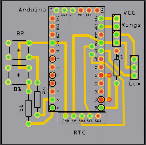 Nota: Usted puede haber notado un cable de conexión entre los pines de Arduino 11 y A0, esto es de hecho un error sobrante de un diseño anterior. No cambia la función del reloj si se deja o se elimina. La fotografía del grabado PCB también contiene un error, pero ya he arreglado lo y el diagrama es correcto.