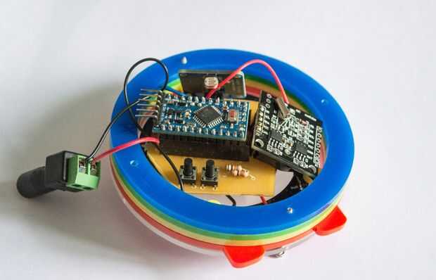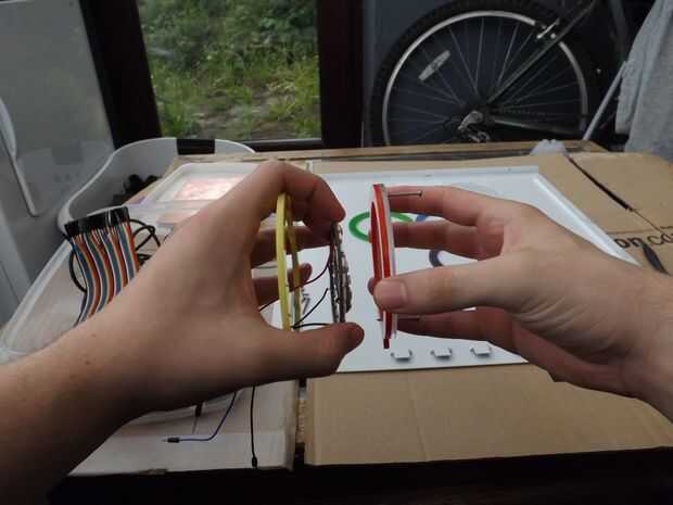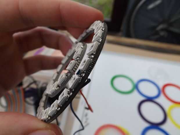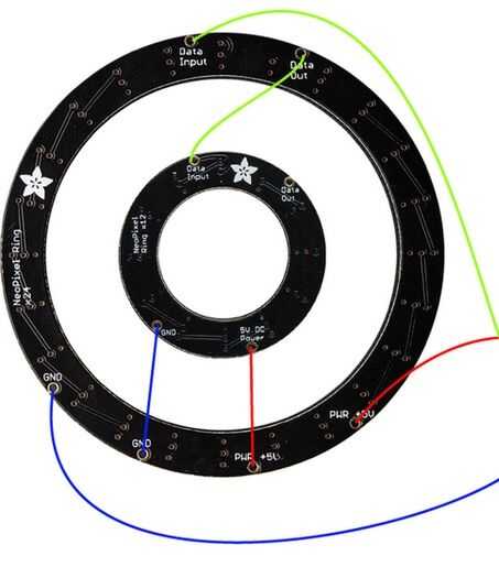 En primer lugar, usted tendrá que montar los anillos de Pixel Neo. Los anillos están conectados entre sí por 3 cables; + 5V dc (rojo), tierra (azul) y una línea de datos (verde). Debe indicarse claramente en los anillos de que conexión es que pero he incluido un diagrama para mostrar cómo están conectados para arriba. Cada anillo tiene tres aristas para marcar importantes LEDs. El punto áspero medio será la parte superior del anillo; o el 12 de o posición. Asegúrese de que estos se alineen ambos anillos. Una vez que los anillos son ensamblados debe dejar con los alambres del árbol listos para conectarse a la placa de circuito principal. El cable de tierra puede conectarse directamente el pin GND de Arduino y el + cable dc de 5V puede conectar directamente a Vcc pin en el Arduino. También puede conectar el cable de datos directamente a un pin de salida digital pero es recomendable que primero pasa a través de un resistor de 470 Ohm. Esto debe ser construido en su placa de circuito principal de todos modos y debe estar conectado para pin digital 10 en el Arduino.