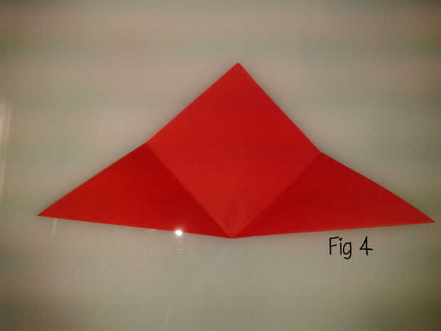 A continuación, doblar cada una de las dos esquinas de cada extremo del borde largo hasta la otra esquina al pliegue (Fig. 3), luego doblar hacia abajo otra vez (Fig. 4).