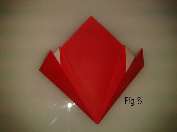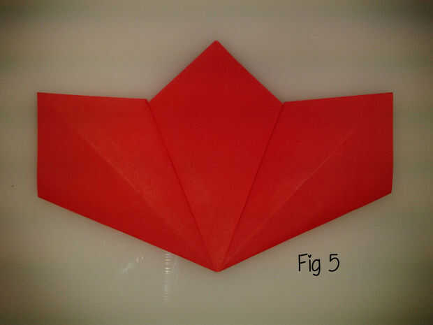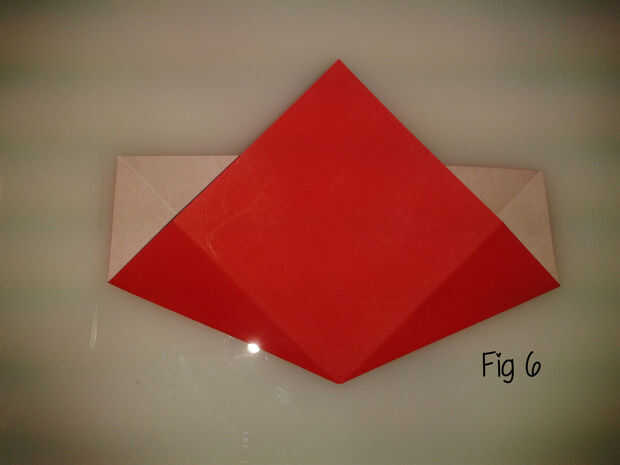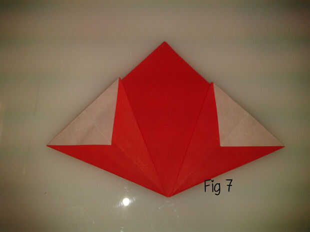 Doblar uno de los rincones en el pliegue del sólo hecho y aplastar abajo para que lo que era el borde recorre el centro de la aleta, en la parte superior del pliegue. Lo mismo con la otra esquina, por lo que parece es como figura 5 de la parte delantera y fig 6 de la parte posterior.