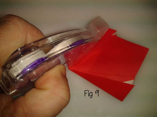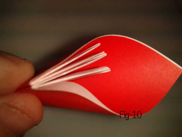 A continuación, doble hacia adentro las dos aletas que tenemos en la figura 8. Ejecutar algunos pegamento por un lado de la aleta (fig 9) y presiona las dos aletas para crear un pétalo (fig 10). Fijar con una clavija de ropa mientras el pegamento seca!