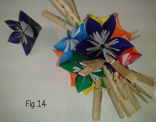 Una vez que ha hecho esto, es hora de empezar a pegar las flores individuales. Para ello, ejecute un pegamento a lo largo de la espina dorsal de un pétalo de tres flores de colores diferentes. Espinas de prensa los tres juntos hasta que se encuentren las puntas de los pétalos y sostenga junto con una clavija de ropa hasta que el pegamento se haya secado. Repita con el siguiente pétalo, para que cada flor termina unido a una flor de cada uno de los otros colores por dos pétalos. No tener la tentación de pegar muchos a la vez, especialmente una vez que la bola comienza a acumularse - las flores requerirá un poco de presión a mantener en su lugar y las áreas más donde el pegamento está todavía húmedo, más difícil que es hacerlo.