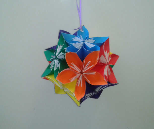 No tienes que colgar tu bola si no quiere. Sería una gran decoración, o se podría conectar a una clavija para que sea como una flor, pero decidimos hacer un móvil para colgar. Todo lo que necesitas hacer es hacer un agujero en una esquina de una flor, lazo con alguna cinta o cordón y colgar!