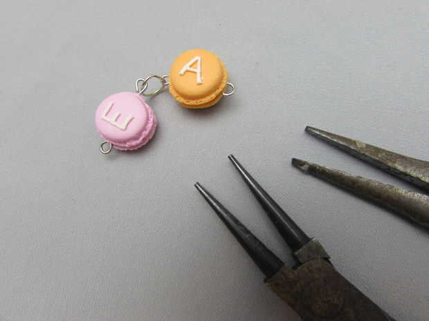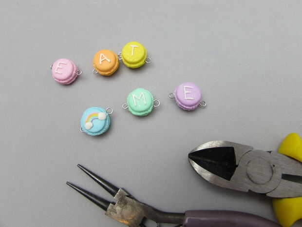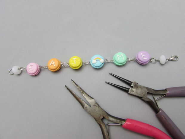 Para hacer una pulsera de longitud de 8 pulgadas que se ajuste a mi muñeca, he añadido 2 charms de bolas de vidrio en ambos extremos de los macarons.