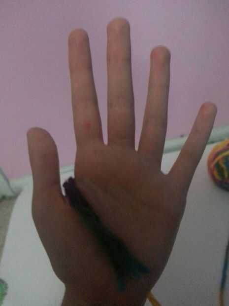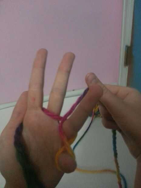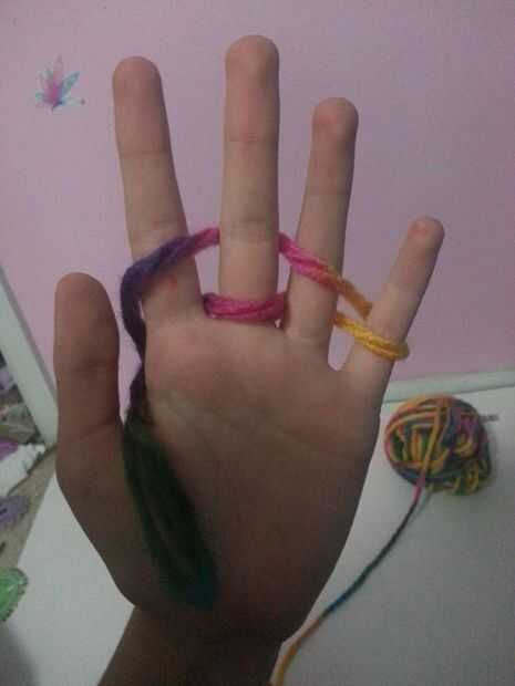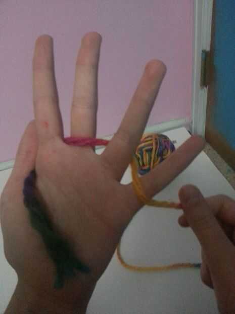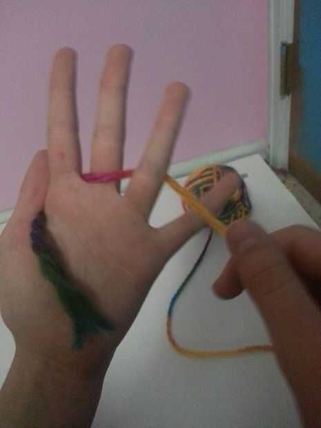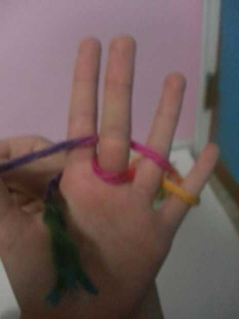 1. ahora, toma el hilo de trabajo (el hilo de la bola) y traer detrás el dedo índice, delante de su dedo medio, detrás de su dedo anular y delante de su dedo meñique. 2. a continuación, llevar el hilo de trabajo detrás del dedo meñique, frente tour anillo dedo, detrás de su dedo medio y así sucesivamente.