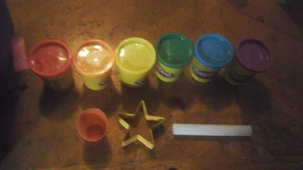 Haz rojo naranja amarillo verde azul morado Play-Doh un cortador circular de rodillo y un cortador en forma de estrella