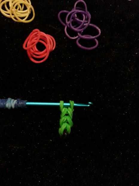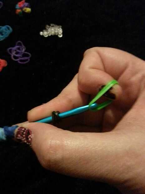 ahora toma dos del mismo color y tire de ellas a través de la banda negra. hacer esto otra vez tres veces más con ese mismo color. Ponga un clip hasta el final y quitar el gancho. tuya debe parecerse a la última foto.