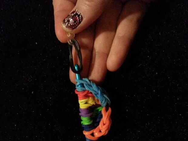 ahora toma dos bandas negras y colocar un clip sobre ellos. Esto evitará que las bandas de recorrer todo el camino. Tire de las bandas negras a través de los siete colores, después ponerlos el gancho del otro extremo de las bandas negras. Ahora usted puede sacar el clip. su proyecto debe buscar al igual que mi último cuadro.