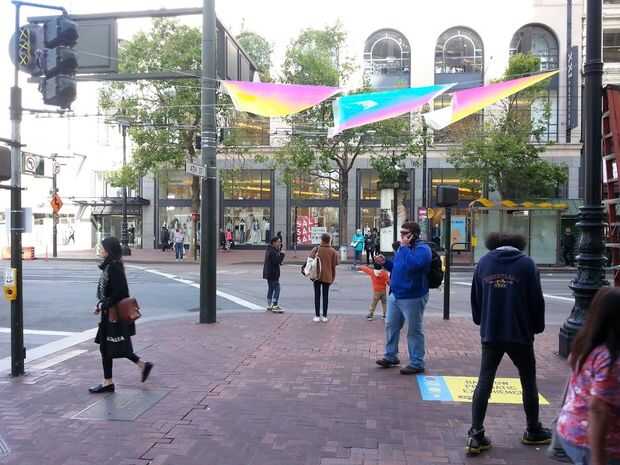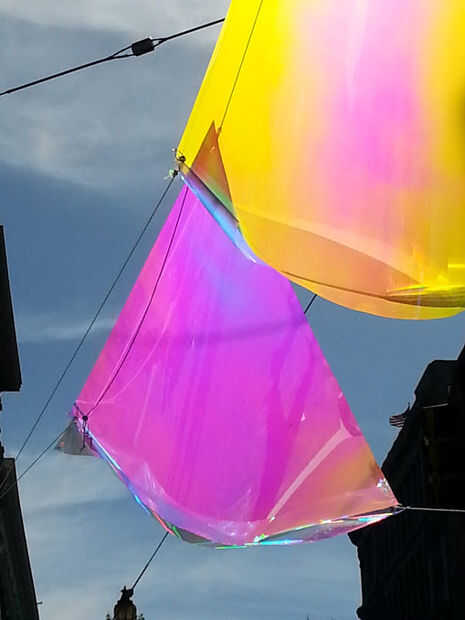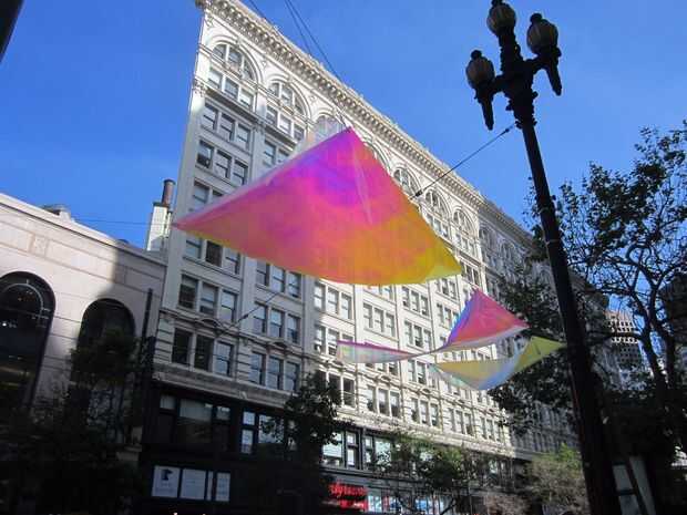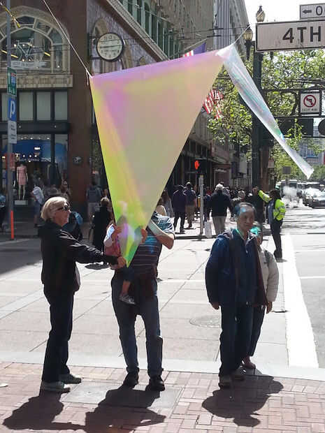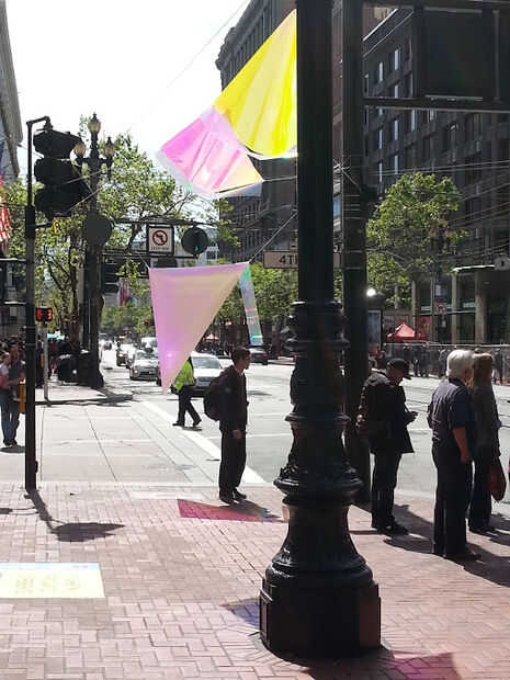 En el día del Festival de prototipos de calle mercado nuestro prototipo fue inicialmente no correctamente un ángulo para producir máximo arco iris. Además no era lo suficientemente resistente para soportar el viento de 10 a 18 mph de la ubicación. Uno por uno, las velas rasgadas y cayó como el viento aumentando (fotografiado arriba). Sin embargo, esto fue una gran experiencia de aprendizaje. Una vez que las velas cayeran y suspendido de dos puntos de suspensión fueron correctamente angulados para máximo arco iris! Lamentablemente el reflexivo-ness del material fue cegador tráfico de coches y bicicletas en venir. A pesar de ese riesgo, nos enteramos de que las velas se suspendieron demasiado alto. Personas disfrutan mirando a sí mismos en el reflejo prismático del material, sacando fotos y en general ser temor de su efecto y reflexiones.