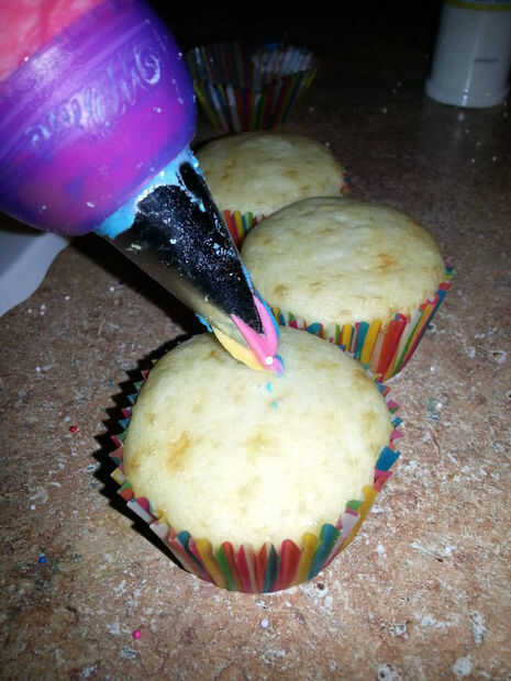 Aplique el glaseado en forma de remolino. Empezar a aplicar hielo en el centro de la cupcake. Con una presión constante, trabajar al borde de la Magdalena y se aplica en un movimiento circular. Continuar la construcción de anillo mientras se trabaja hacia el centro para formar un poco de forma de cono. Dejar de exprimir y luego levante.