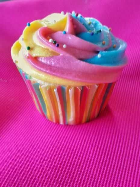Este es el pastel de arco iris que hice para el cumpleaños 18 de mi amiga holly. Utilicé una mezcla de colorantes de alimento líquido de asda y de waitrose para teñir cada una de las 6 capas de esponja básica. La guinda que utilicé fue una escarcha c