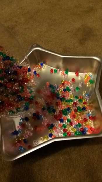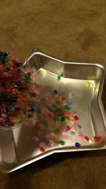 Vierta algunas cuentas en la torta. No vierta lo suficiente para cubrir el fondo entero de la bandeja de la torta porque eso hará que el arreglo de los granos en la olla más difícil.