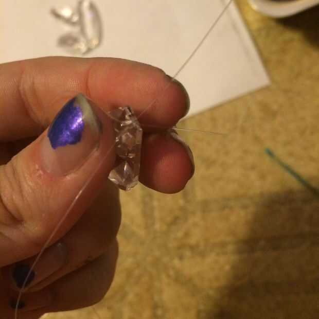 Hilo de piedras preciosas y prismas en la línea de pesca. Para hacerlos parecer como que están flotando en la cadena, pase el extremo de la línea de pesca a través de la Página 1 de piedras preciosas/prisma a través del ayudante 2 de la piedra preciosa/prisma y luego a través de uno nuevo. Crea un bucle que mantendrá la joya/prisma en lugar a menos que usted tire mucho.