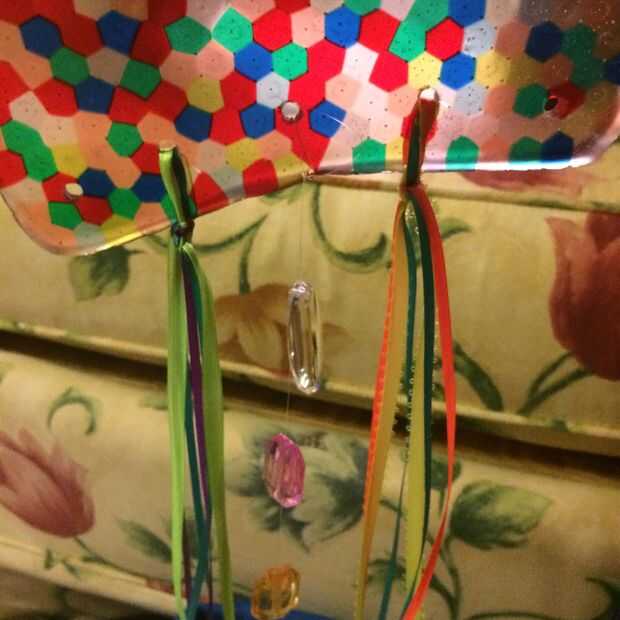 Este es el paso que usted puede también atar las cintas en el suncatcher si desea utilizar cinta así. Yo alternaba las decoraciones que pongo con cada agujero. Tengo 5 agujeros en la parte inferior de la suncatcher así que alternados para crear un patrón de: