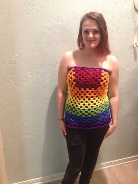 Yo de ganchillo un cuadrado granny en rojo, luego en naranja que yo de ganchillo alrededor de 3 lados entonces lo mismo con el amarillo, verde, azul púrpura entonces. Luego añadí púrpura en la parte superior de la camisa. Luego coser la espalda y tienes una camiseta arco iris hermoso, punto a destacar de la multitud!