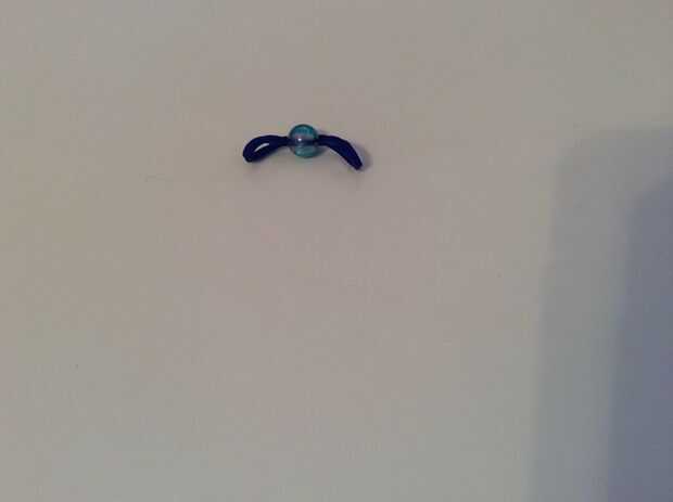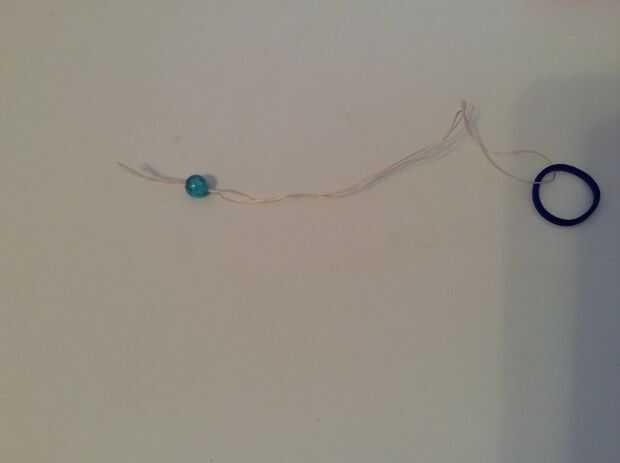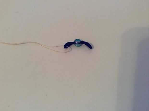 Tomar el hilo y ponerlo a través de un cordón. Luego empuje el talón hacia abajo de la seda dental y en el centro de la banda de goma. Luego deshacer el hilo y llevarlo.