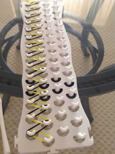 se necesita: un telar del arco iris, un gancho, bandas de goma y de un ' clip o clip de 'c'.Paso 1: Colocación de las bandas Con las bandas de color de rosa, mueva la banda de la clavija central a la izquierda e ir en línea recta hasta el segundo d a