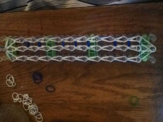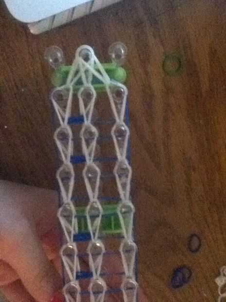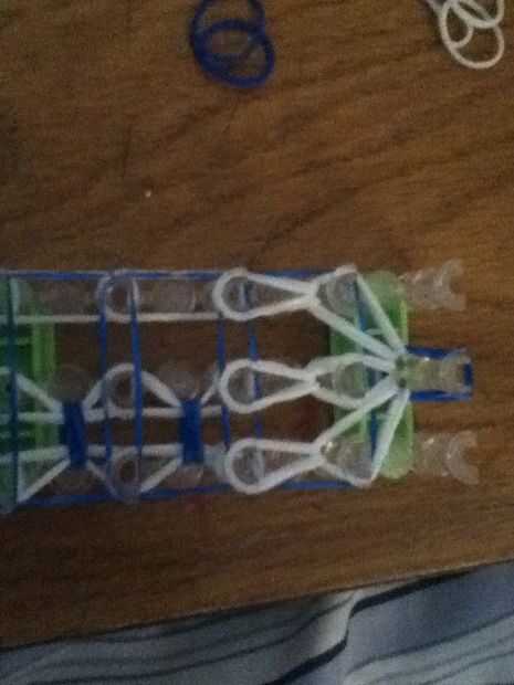 Al llegar al final, envuelve las bandas de la fila superior y centro alrededor de la primera clavija en el centro.