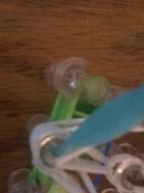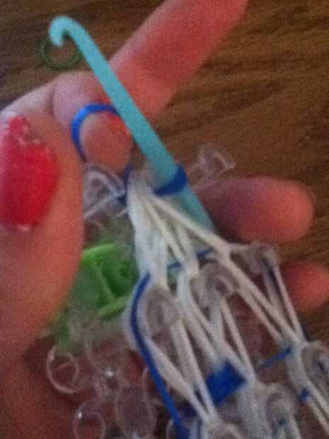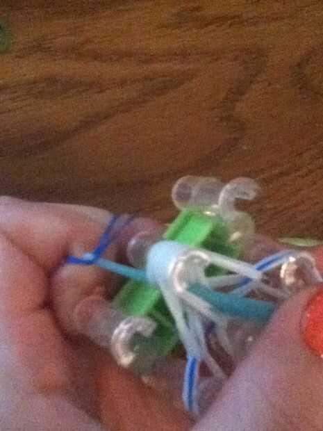 Enrolle la banda retorcida alrededor del gancho y tire hacia arriba a través de la clavija. (Este paso es un poco difícil debido a todas las bandas blancas alrededor de la clavija central. Funciona mejor si te enfrentas al extremo abierto del gancho hacia fuera hacia usted para que lo no accidentalmente aferrarse a alguna de las bandas blanco.)