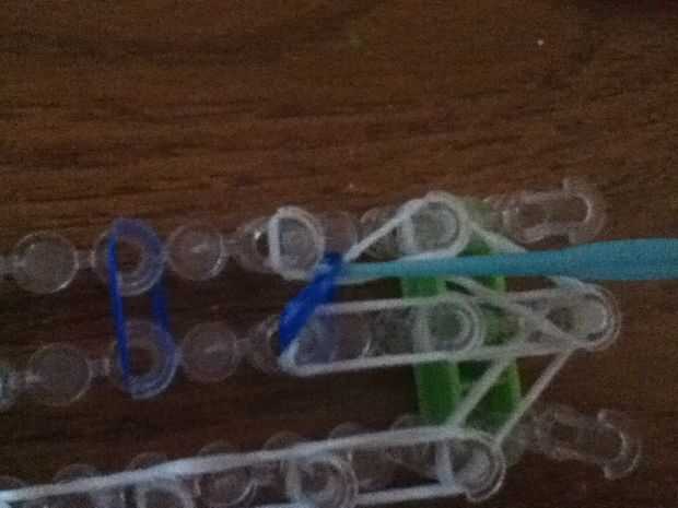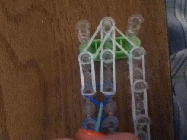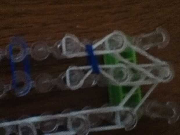 Ahora quieres tirar tu primera clave alrededor de las clavijas. Utiliza tu gancho para agarrar la banda de fuera de los lazos blancos. Tire de la banda encima por lo que termina envuelto en las bandas, pero no envuelve ningún clavijas.