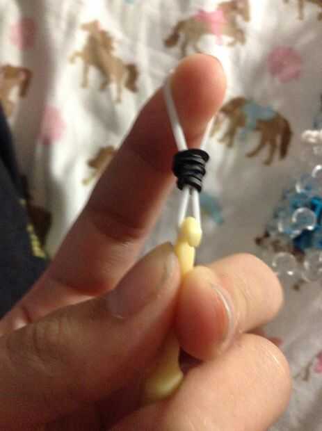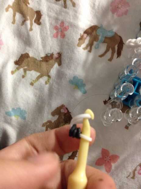 Ahora toma tu gancho y envolver una banda de goma negra alrededor de 4 veces. Luego tomar un unshaved Caniche color goma y poner en la parte curva si el gancho. Luego deslice la banda de caucho negro en la goma y poner la goma elástica totalmente en el gancho. Luego coloque la boca en la banda de goma sobre el cuello que es en forma de triángulo