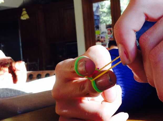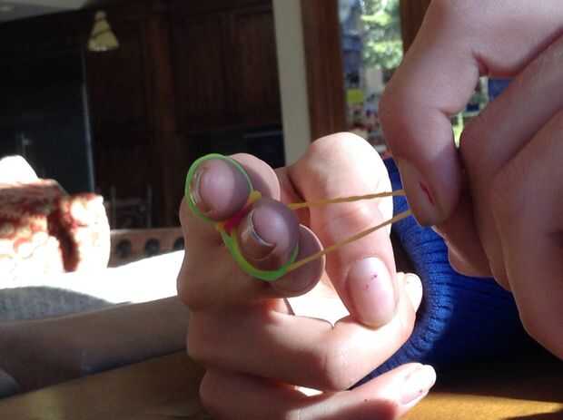 Repetir paso 3 mientras que agrega otra banda de goma en la parte superior por lo que siempre habrá tres bandas de goma en los dedos. Pero recuerda no hacerlo torceduras más.