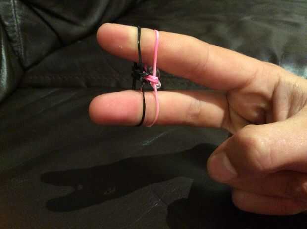 manera fácil de hacer una pulsera de cola de pescado en cualquier lugar.Paso 1: materiales Todo lo que necesitas esSu elección de colores de gomasy un clip C o SPaso 2: Poner la primera banda de goma de color en una figura de ocho en los dos dedos. P