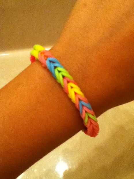 manera fácil de hacer una pulsera de cola de pescado en cualquier lugar.Paso 1: materiales Todo lo que necesitas esSu elección de colores de gomasy un clip C o SPaso 2: Poner la primera banda de goma de color en una figura de ocho en los dos dedos. P