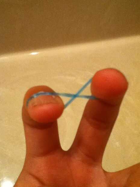 manera fácil de hacer una pulsera de cola de pescado en cualquier lugar.Paso 1: materiales Todo lo que necesitas esSu elección de colores de gomasy un clip C o SPaso 2: Poner la primera banda de goma de color en una figura de ocho en los dos dedos. P