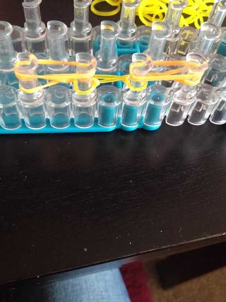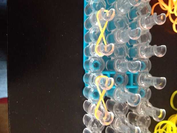 Una banda de goma en los dos pasadores de la torcedura. Y hacerlo otra vez con otra banda elástica.