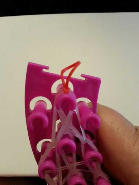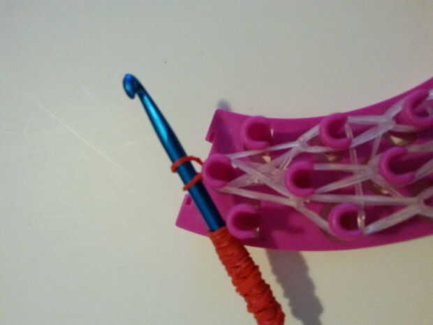Ponga el gancho a través de la clavija superior con todas las bandas (Foto 1) y Enrosque una bandas de color de su elección (estoy usando)(pic 2) rojo y bloquearla para que los venda no desentrañar toda su obra. (Foto 3)