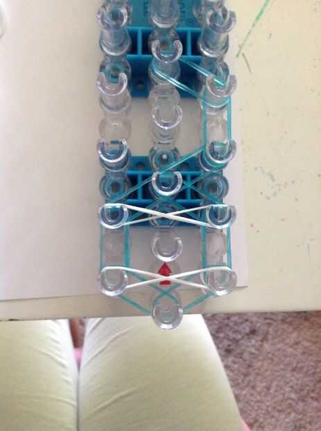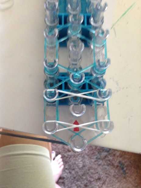 En la clavija que culminó con el, vas a comenzar con. Es el mismo patrón de bandas. Tomar una banda y lugar de esa clavija central a la clavija de la derecha. Luego tomar otro y subir una peg. Entonces terminas ese lado con una banda que va desde peg al centro. Para hacer el otro lado, volver a nuestro primer peg que comenzamos con. (La 3ª clavija central). Tome otra banda y vaya de peg a la izquierda. Luego de eso peg a la siguiente. Finalmente, vaya de eso peg al centro. Tomar una banda blanca hacer un Figura 8 y poner un extremo en el tercero izquierda peg y la otra en el tercero derecha peg.