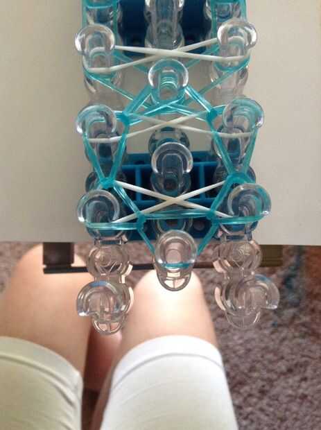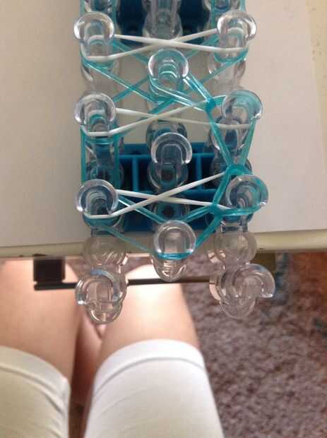 Alcance bajo la banda de la tapa y agarrar la primera banda. Puede conectarlo a la clavija de la derecha. Entonces alcance debajo de todas las bandas y el inferior del gancho agarrador. Gancho en la clavija delante de ella. Luego agarra la banda inferior alcanzando en y gancho al centro. Entonces comienzo a la clavija de la banda de la tapa. Llegar más allá de la banda de la tapa y coge la banda inferior de. Entonces puede conectarlo a la clavija de la izquierda. Alcance debajo de todas las bandas peg y agarrar la banda inferior. Gancho al frente. Finalmente, alcanzar y agarrar la banda inferior para enganchar al centro.